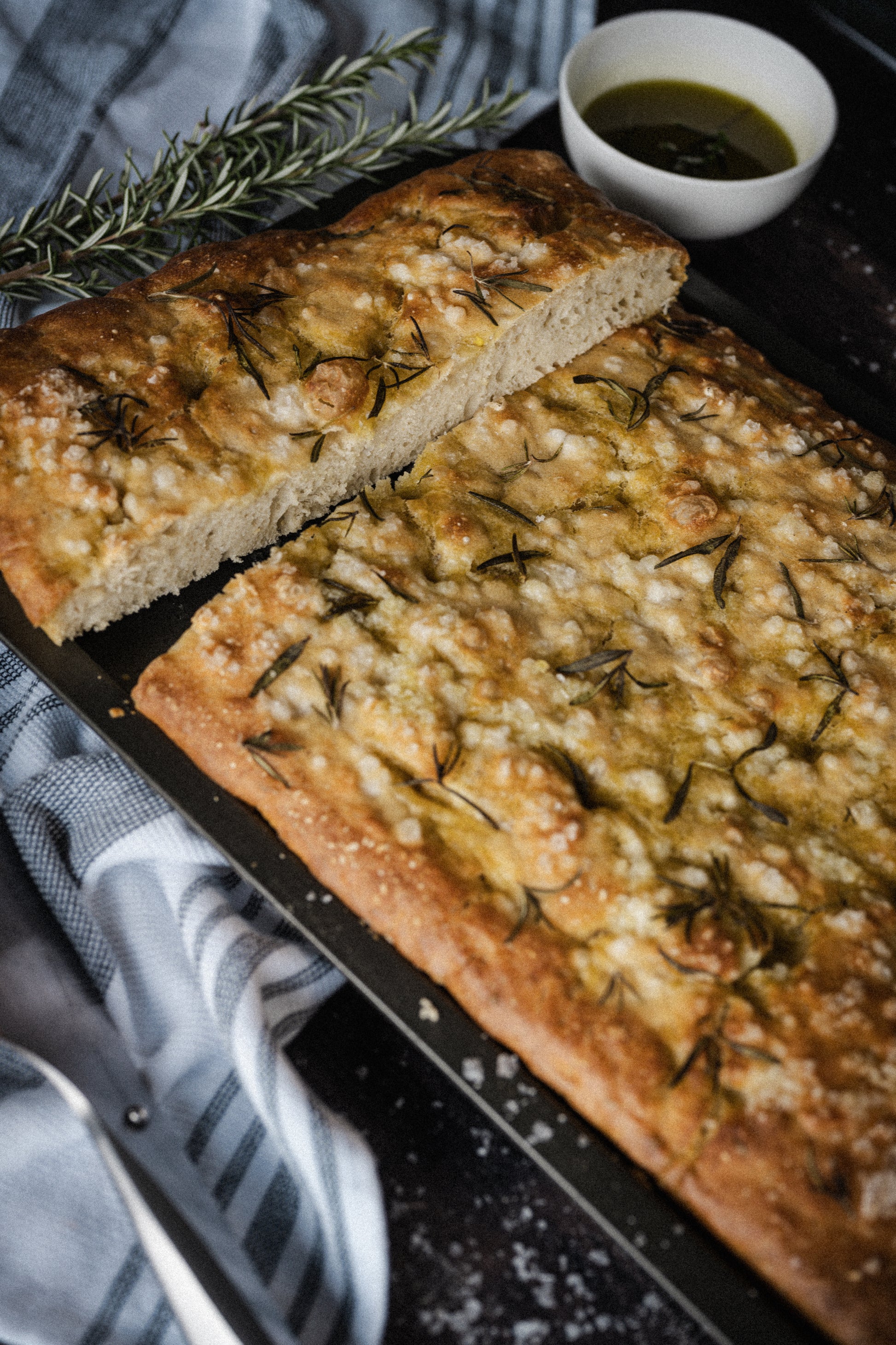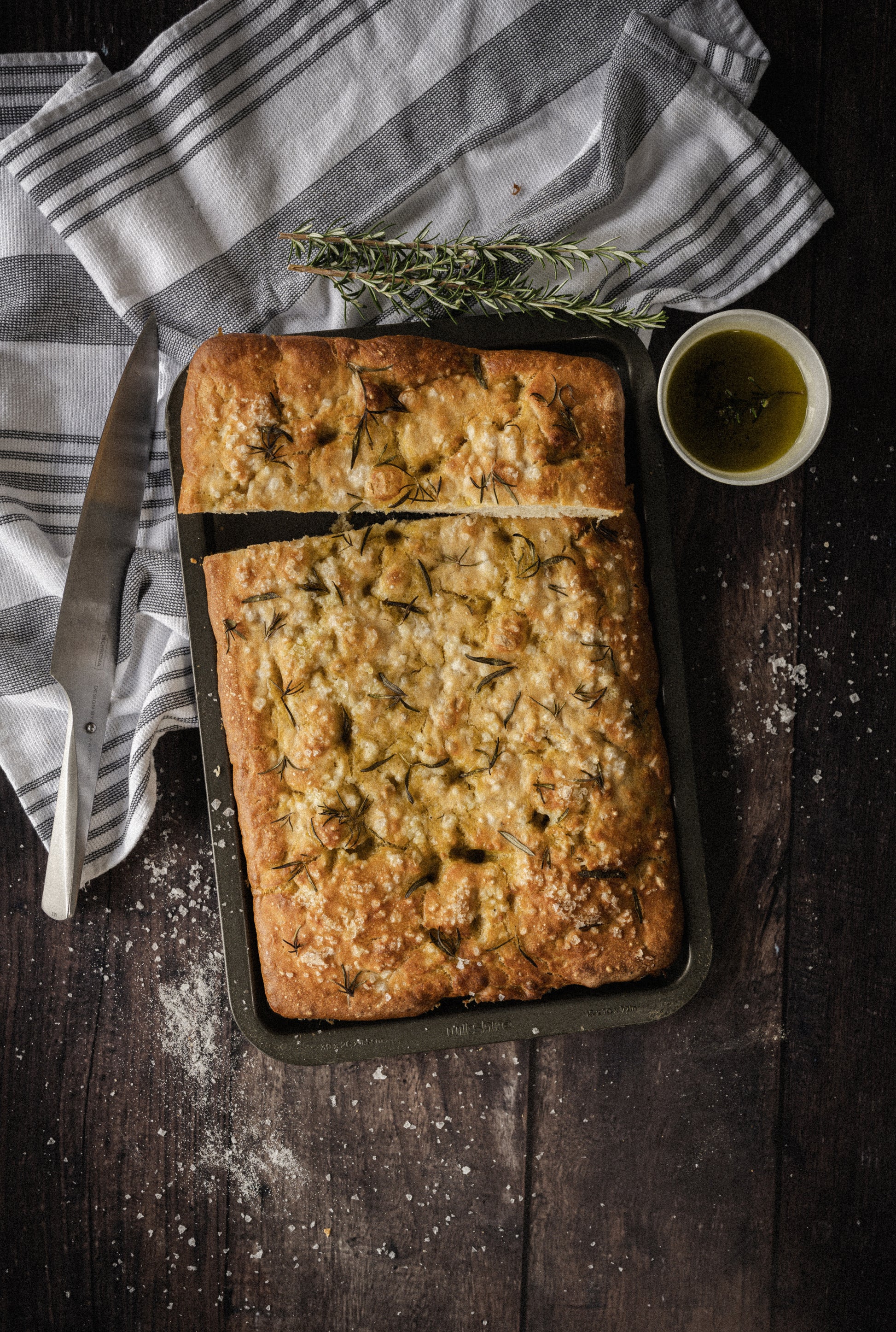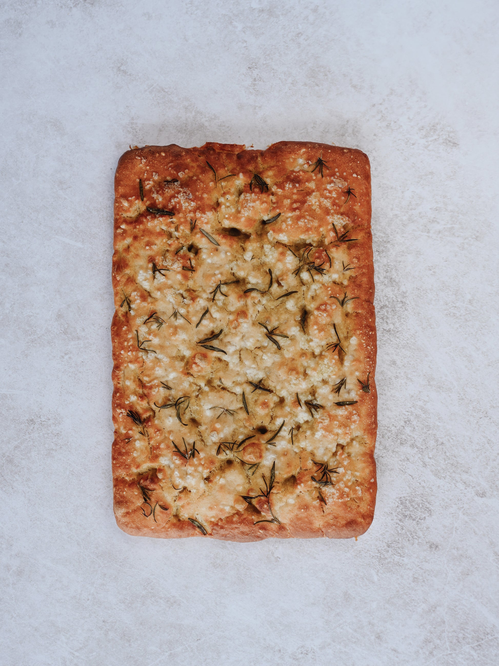 A flat leavened oven-baked Italian bread. Fluffy, crusted and full of flavour. Topped with sea salt flakes and homegrown rosemary.